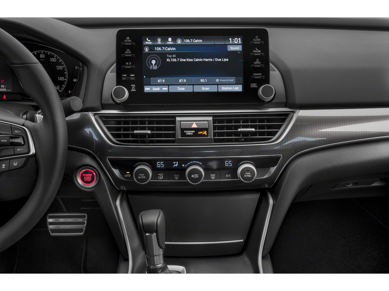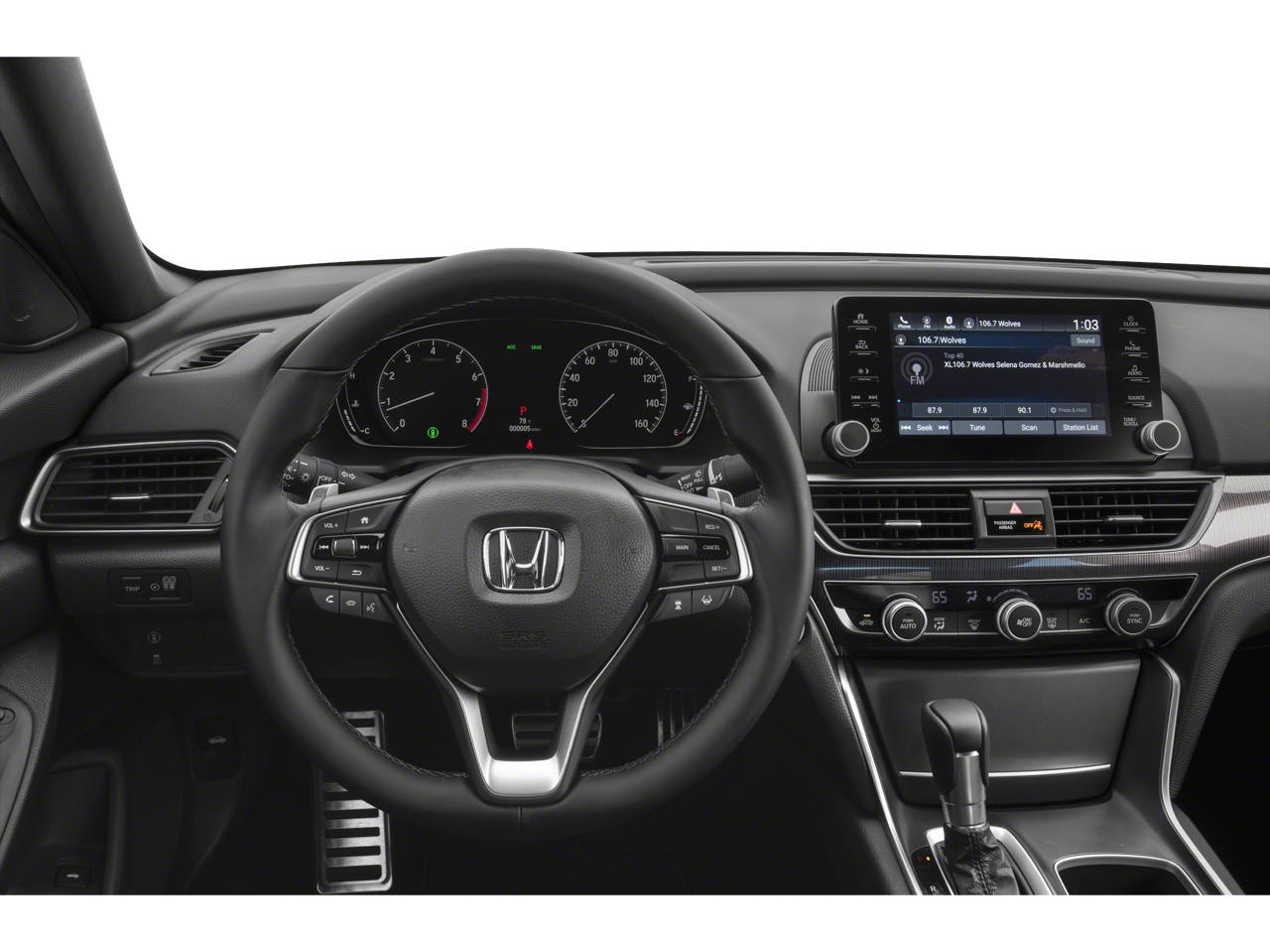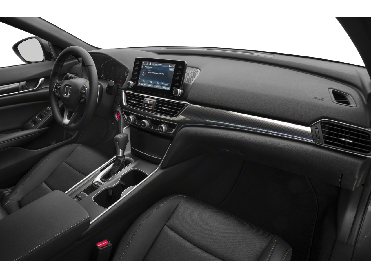 Cloth, 4-Wheel Disc Brakes, 8 Speakers, ABS brakes, Air Conditioning, Alloy wheels, AM/FM radio, Apple CarPlay/Android Auto, Auto High-beam Headlights, Automatic temperature control, Brake assist, Bumpers: body-color, Cloth Seat Trim, Delay-off headlights, Driver door bin, Driver vanity mirror, Dual front impact airbags, Dual front side impact airbags, Electronic Stability Control, Emergency communication system: HondaLink, Exterior Parking Camera Rear, Forward collision: Collision Mitigation Braking System (CMBS) + FCW mitigation, Four wheel independent suspension, Front anti-roll bar, Front Bucket Seats, Front Center Armrest, Front dual zone A/C, Front fog lights, Front reading lights, Fully automatic headlights, Illuminated entry, Knee airbag, Leather Shift Knob, Leather steering wheel, Low tire pressure warning, Occupant sensing airbag, Outside temperature display, Overhead airbag, Overhead console, Panic alarm, Passenger door bin, Passenger vanity mirror, Power door mirrors, Power driver seat, Power steering, Power windows, Radio data system, Radio: 180-Watt AM/FM Audio System, Rear anti-roll bar, Rear seat center armrest, Rear window defroster, Remote keyless entry, Security system, Speed control, Speed-sensing steering, Speed-Sensitive Wipers, Split folding rear seat, Spoiler, Steering wheel mounted audio controls, Tachometer, Telescoping steering wheel, Tilt steering wheel, Traction control, Trip computer, Variably intermittent wipers, Wheels: 19 Machine-Finished Alloy w/Black Inserts.