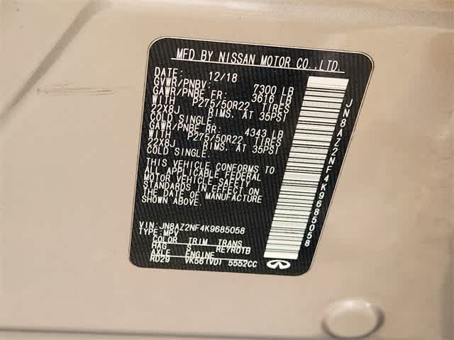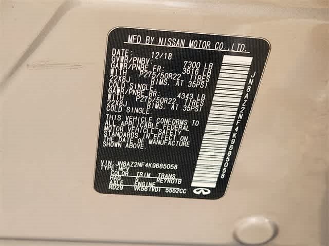 120V Power Outlet, 13 Speakers, 2.94 Axle Ratio, 22 Wheel Package, 3rd row seats: split-bench, 4-Wheel Disc Brakes, ABS brakes, Advanced Climate Control System, Air Conditioning, Alloy wheels, AM/FM radio: SiriusXM, Anti-whiplash front head restraints, Auto High-beam Headlights, Auto tilt-away steering wheel, Auto-dimming door mirrors, Auto-dimming Rear-View mirror, Auto-leveling suspension, Automatic temperature control, Backup Collision Intervention (BCI), Blind Spot Intervention (BSI), Blind Spot Warning, Bose Cabin Surround Sound System, Brake assist, Bumpers: body-color, CD player, Charcoal/Espresso Burl Trim, Chrome Outside Mirror Caps, Climate-Controlled Front Seats, Delay-off headlights, Driver door bin, Driver vanity mirror, Dual 8 Color Monitors, Dual front impact airbags, Dual front side impact airbags, DVD-Audio, Electronic Stability Control, Emergency communication system: INFINITI Connection, Four wheel independent suspension, Front anti-roll bar, Front Bucket Seats, Front Center Armrest, Front dual zone A/C, Front fog lights, Front reading lights, Fully automatic headlights, Garage door transmitter: HomeLink, Genuine wood console insert, Genuine wood dashboard insert, Genuine wood door panel insert, Heated 2nd-Row Seats, Heated door mirrors, Heated Front Bucket Seats, Heated front seats, Heated steering wheel, Illuminated entry, Intelligent Cruise Control (Full-Speed Range), Lane Departure Warning System, Leather Shift Knob, Leather steering wheel, Leather-Appointed Seats w/Stratford Burl Trim, Literature Kit, Low tire pressure warning, Memory seat, Navigation system: INFINITI InTouch Navigation, Occupant sensing airbag, Outside temperature display, Overhead airbag, Overhead console, Panic alarm, Passenger door bin, Passenger vanity mirror, Power door mirrors, Power driver seat, Power Liftgate, Power moonroof, Power passenger seat, Power steering, Power windows, ProASSIST Package, Radiant Illuminated Kick Plates, Radio data system, Radio: AM/FM/HD w/Single In-Dash CD/DVD Player & MP3, Rain sensing wipers, Rear air conditioning, Rear anti-roll bar, Rear audio controls, Rear reading lights, Rear seat center armrest, Rear window defroster, Rear window wiper, Reclining 3rd row seat, Remote keyless entry, Roof rack: rails only, Security system, Semi-Aniline Leather-Appointed Seating w/Quilting, Sensory Package, Speed control, Speed-sensing steering, Split folding rear seat, Spoiler, Steering wheel memory, Steering wheel mounted audio controls, Tachometer, Telescoping steering wheel, Theater Package, Tilt steering wheel, Traction control, Trip computer, Turn signal indicator mirrors, Variably intermittent wipers, Voltmeter, Wheels: 20 x 8.0 Aluminum-Alloy, Wheels: 22 x 8.0 14-Spoke Forged Aluminum-Alloy, Wireless Headphones (2).