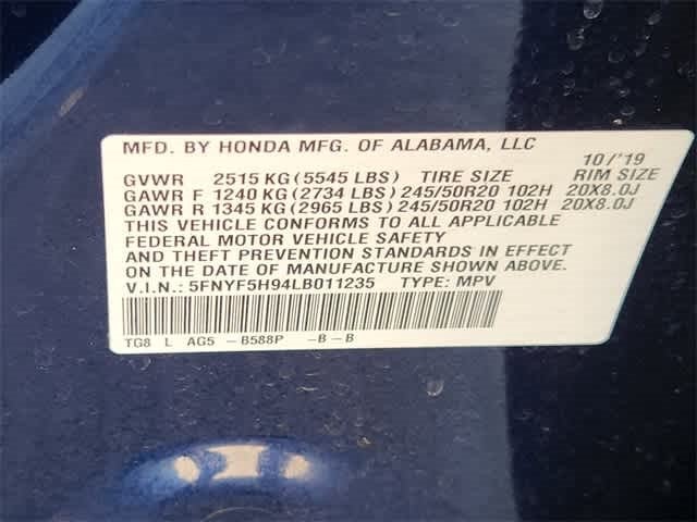 10 Speakers, 3rd row seats: split-bench, 4-Wheel Disc Brakes, A/V remote: CabinControl, ABS brakes, Air Conditioning, Alloy wheels, AM/FM radio: SiriusXM, Apple CarPlay/Android Auto, Auto High-beam Headlights, Auto-dimming Rear-View mirror, Automatic temperature control, Blind Spot Information (BSI) System warning, Brake assist, Bumpers: body-color, Compass, Delay-off headlights, Driver door bin, Driver vanity mirror, Dual front impact airbags, Dual front side impact airbags, Electronic Stability Control, Emergency communication system: HondaLink, Exterior Parking Camera Rear, Forward collision: Collision Mitigation Braking System (CMBS) + FCW mitigation, Four wheel independent suspension, Front anti-roll bar, Front Bucket Seats, Front Center Armrest, Front dual zone A/C, Front fog lights, Front reading lights, Fully automatic headlights, Garage door transmitter: HomeLink, Headphones, Heated door mirrors, Heated Front Bucket Seats, Heated front seats, Heated rear seats, Honda Satellite-Linked Navigation System, Illuminated entry, Lane departure: Lane Keeping Assist System (LKAS) active, Leather Seat Trim, Low tire pressure warning, Memory seat, Navigation system: Honda Satellite-Linked Navigation System, Occupant sensing airbag, Outside temperature display, Overhead airbag, Overhead console, Panic alarm, Passenger door bin, Passenger vanity mirror, Power door mirrors, Power driver seat, Power Liftgate, Power moonroof, Power passenger seat, Power steering, Power windows, Radio data system, Radio: 590-Watt Premium Audio System, Rear air conditioning, Rear anti-roll bar, Rear audio controls, Rear reading lights, Rear seat center armrest, Rear window defroster, Rear window wiper, Reclining 3rd row seat, Remote keyless entry, Roof rack: rails only, Security system, Speed control, Speed-sensing steering, Speed-Sensitive Wipers, Split folding rear seat, Spoiler, Steering wheel mounted audio controls, Tilt steering wheel, Traction control, Trip computer, Turn signal indicator mirrors, Variably intermittent wipers, Wheels: 20 Machine-Finished Alloy. CARFAX One-Owner.
