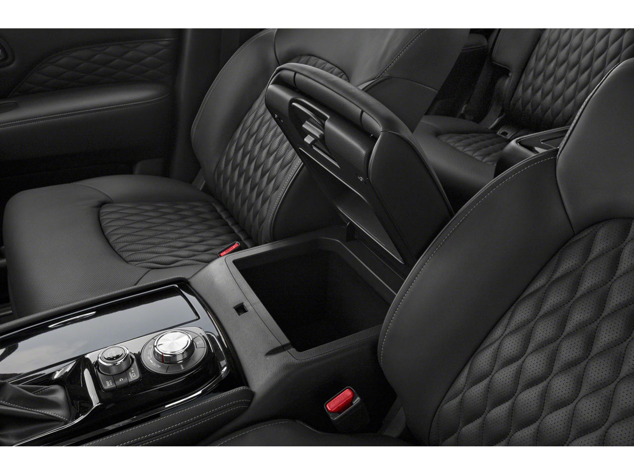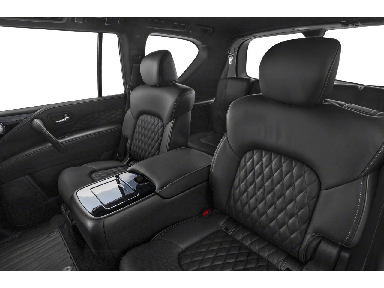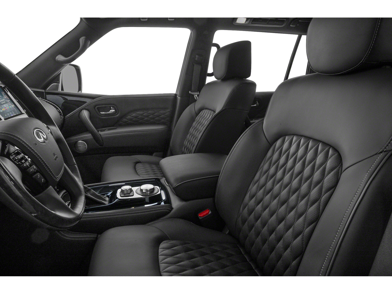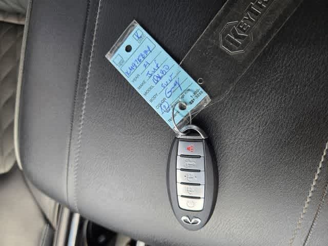 17 Speakers, 2.937 Axle Ratio, 3rd row seats: split-bench, 4-Wheel Disc Brakes, A/V remote, ABS brakes, Air Conditioning, All-Season Floor Mats, All-Season Package, Alloy wheels, AM/FM radio: SiriusXM, Anti-whiplash front head restraints, Apple CarPlay/Android Auto, Auto High-beam Headlights, Auto tilt-away steering wheel, Auto-dimming door mirrors, Auto-dimming Rear-View mirror, Auto-leveling suspension, Automatic temperature control, Brake assist, Bumpers: body-color, Cargo Package, Cargo Protector, CD player, Climate Controlled Front Bucket Seats, Compass, Delay-off headlights, Driver door bin, Driver vanity mirror, Dual front impact airbags, Dual front side impact airbags, DVD-Audio, Electronic Stability Control, Emergency communication system: INFINITI Connection, First-Aid Kit, Four wheel independent suspension, Front anti-roll bar, Front Bucket Seats, Front Center Armrest, Front dual zone A/C, Front fog lights, Front reading lights, Fully automatic headlights, Garage door transmitter: HomeLink, Headlight cleaning, Headphones, Heated door mirrors, Heated front seats, Heated rear seats, Heated steering wheel, High-Density Non-Slip Rear Cargo Carpet, Illuminated entry, Leather Shift Knob, Leather steering wheel, Literature Kit, Low tire pressure warning, Memory seat, Navigation system: INFINITI InTouch Navigation, Nylon-Cord Cargo Net, Occupant sensing airbag, Outside temperature display, Overhead airbag, Overhead console, Panic alarm, Passenger door bin, Passenger vanity mirror, Power door mirrors, Power driver seat, Power Liftgate, Power moonroof, Power passenger seat, Power steering, Power windows, Radiant Illuminated Kick Plates, Radio data system, Radio: Bose Performance Audio System w/17 Speakers, Rain sensing wipers, Rear air conditioning, Rear anti-roll bar, Rear audio controls, Rear reading lights, Rear seat center armrest, Rear window defroster, Rear window wiper, Reclining 3rd row seat, Remote keyless entry, Roof Rail Cross Bars, Security system, Semi-Aniline Leather Appointed Seats, Speed control, Speed-sensing steering, Split folding rear seat, Spoiler, Steering wheel memory, Steering wheel mounted audio controls, Tachometer, Telescoping steering wheel, Tilt steering wheel, Traction control, Trip computer, Turn signal indicator mirrors, Variably intermittent wipers, Ventilated front seats, Voltmeter, Welcome Lighting, Wheels: 22 x 8.0 Forged Aluminum-Alloy.