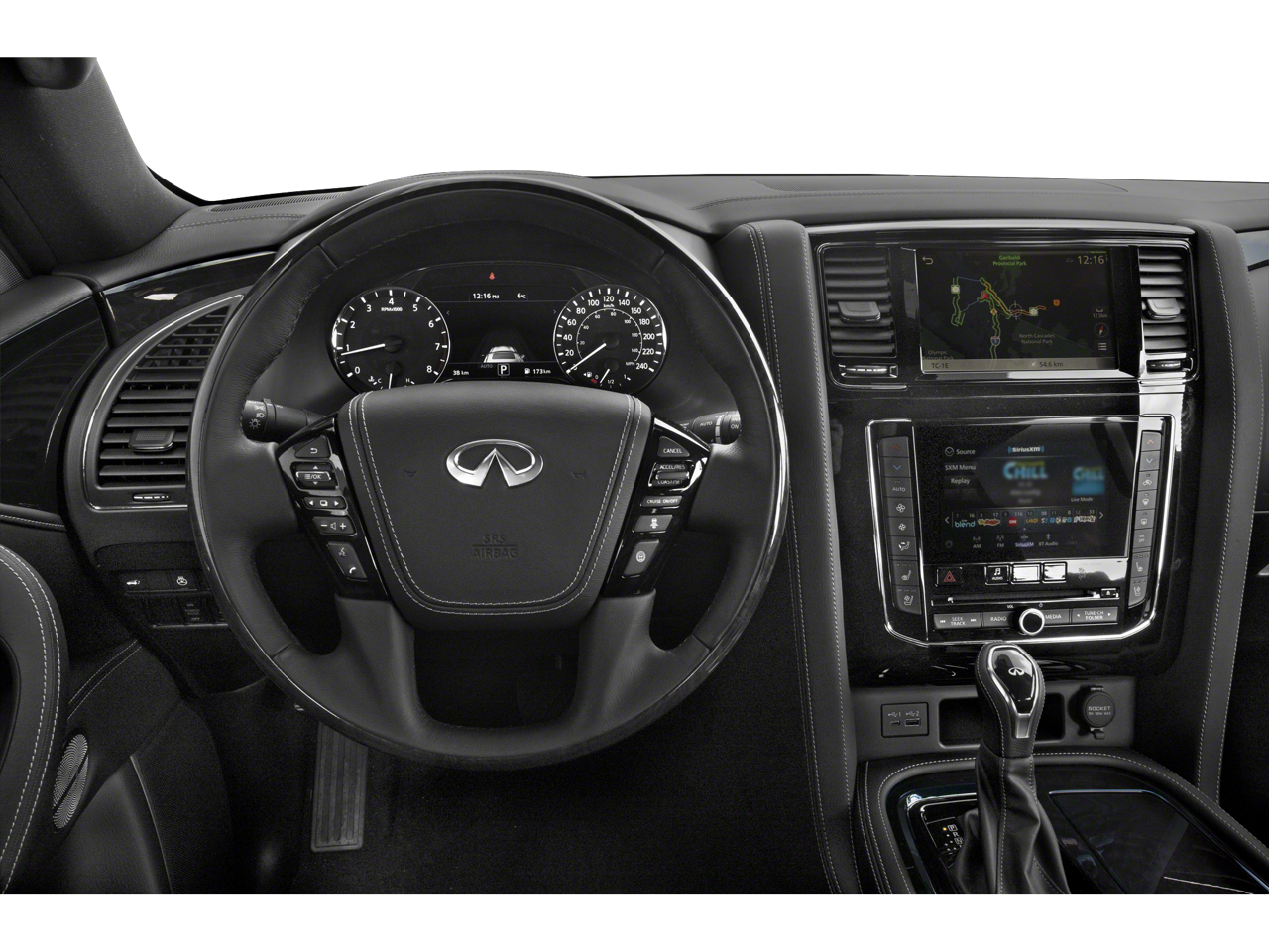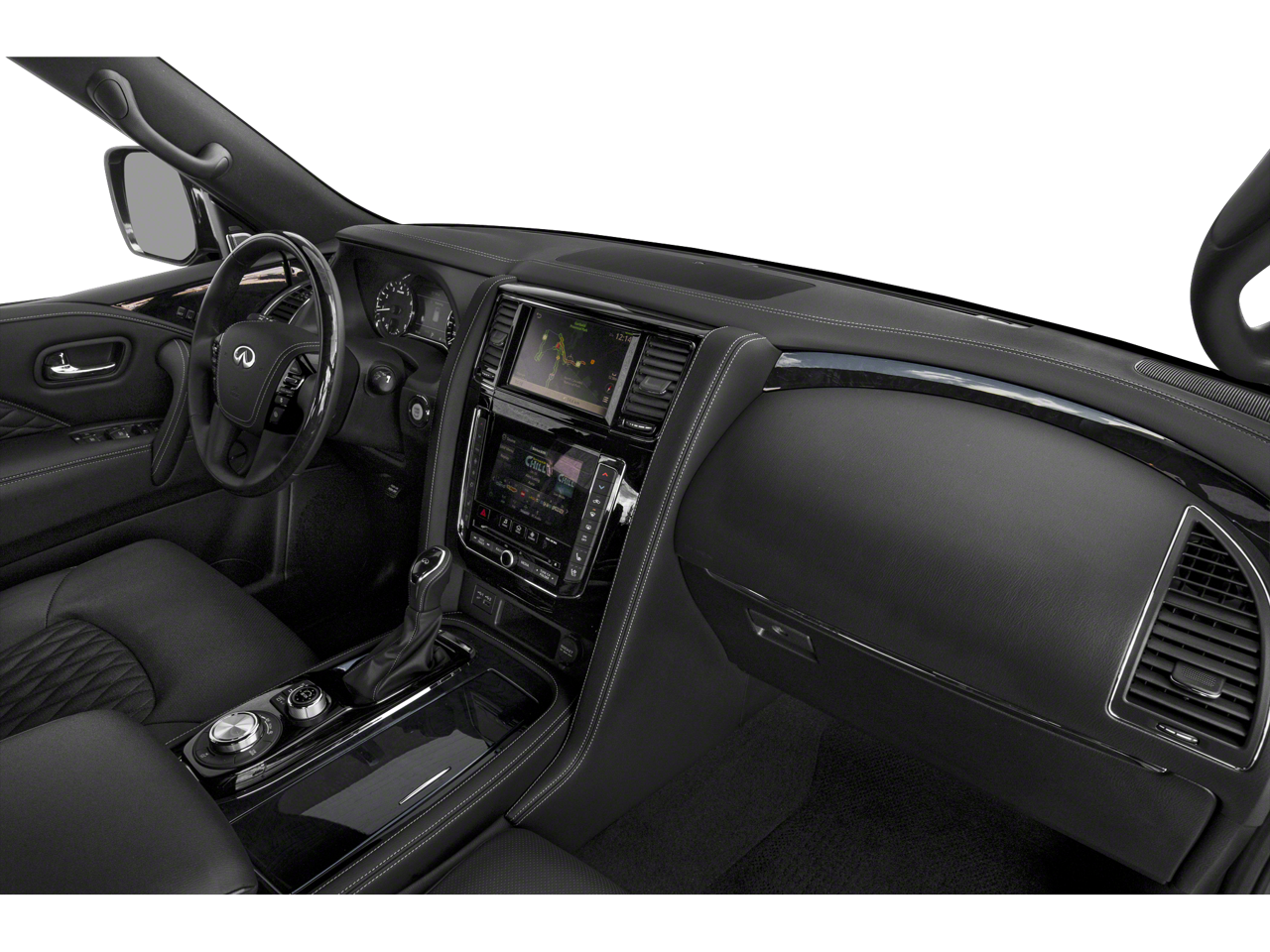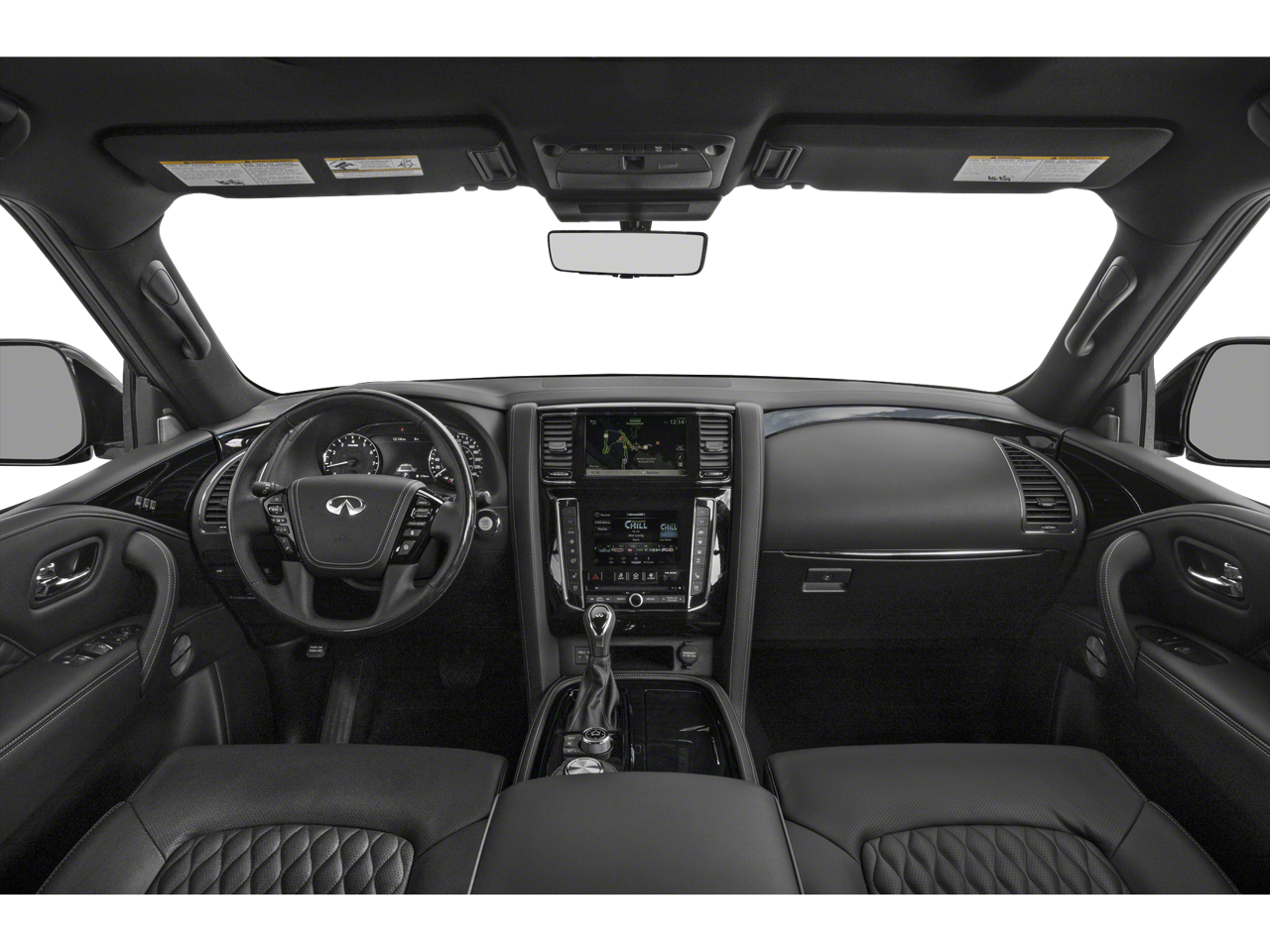 17 Speakers, 2.937 Axle Ratio, 3rd row seats: split-bench, 4-Wheel Disc Brakes, A/V remote, ABS brakes, Air Conditioning, All-Season Floor Mats, All-Season Package, Alloy wheels, AM/FM radio: SiriusXM, Anti-whiplash front head restraints, Apple CarPlay/Android Auto, Auto High-beam Headlights, Auto tilt-away steering wheel, Auto-dimming door mirrors, Auto-dimming Rear-View mirror, Auto-leveling suspension, Automatic temperature control, Brake assist, Bumpers: body-color, Cargo Package, Cargo Protector, CD player, Climate Controlled Front Bucket Seats, Compass, Delay-off headlights, Driver door bin, Driver vanity mirror, Dual front impact airbags, Dual front side impact airbags, DVD-Audio, Electronic Stability Control, Emergency communication system: INFINITI Connection, First-Aid Kit, Four wheel independent suspension, Front anti-roll bar, Front Bucket Seats, Front Center Armrest, Front dual zone A/C, Front fog lights, Front reading lights, Fully automatic headlights, Garage door transmitter: HomeLink, Headlight cleaning, Headphones, Heated door mirrors, Heated front seats, Heated rear seats, Heated steering wheel, High-Density Non-Slip Rear Cargo Carpet, Illuminated entry, Leather Shift Knob, Leather steering wheel, Literature Kit, Low tire pressure warning, Memory seat, Navigation system: INFINITI InTouch Navigation, Nylon-Cord Cargo Net, Occupant sensing airbag, Outside temperature display, Overhead airbag, Overhead console, Panic alarm, Passenger door bin, Passenger vanity mirror, Power door mirrors, Power driver seat, Power Liftgate, Power moonroof, Power passenger seat, Power steering, Power windows, Radiant Illuminated Kick Plates, Radio data system, Radio: Bose Performance Audio System w/17 Speakers, Rain sensing wipers, Rear air conditioning, Rear anti-roll bar, Rear audio controls, Rear reading lights, Rear seat center armrest, Rear window defroster, Rear window wiper, Reclining 3rd row seat, Remote keyless entry, Roof Rail Cross Bars, Security system, Semi-Aniline Leather Appointed Seats, Speed control, Speed-sensing steering, Split folding rear seat, Spoiler, Steering wheel memory, Steering wheel mounted audio controls, Tachometer, Telescoping steering wheel, Tilt steering wheel, Traction control, Trip computer, Turn signal indicator mirrors, Variably intermittent wipers, Ventilated front seats, Voltmeter, Welcome Lighting, Wheels: 22 x 8.0 Forged Aluminum-Alloy.