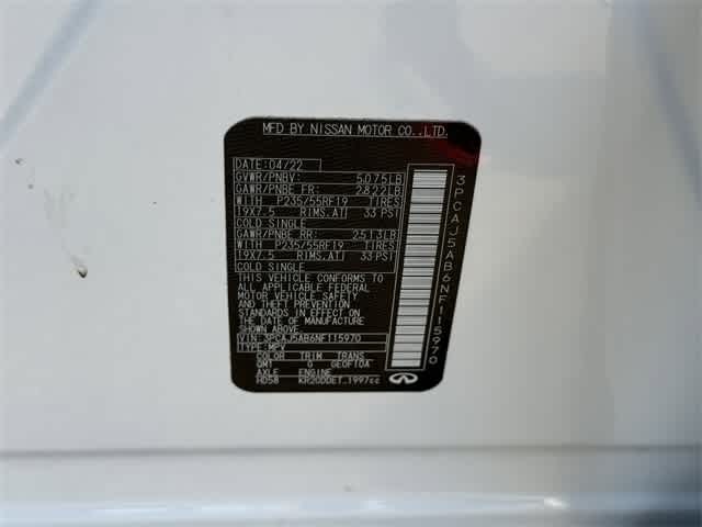 4-Wheel Disc Brakes, 5.846 Axle Ratio, 6 Speakers, ABS brakes, Air Conditioning, Alloy wheels, AM/FM radio: SiriusXM, Anti-whiplash front head restraints, Auto High-beam Headlights, Auto-dimming Rear-View mirror, Automatic temperature control, Black Splash Guards (Set of 4), Brake assist, Bumpers: body-color, CD player, Delay-off headlights, Driver door bin, Driver vanity mirror, Dual front impact airbags, Dual front side impact airbags, Electronic Stability Control, Emergency communication system: INFINITI InTouch, Exterior Parking Camera Rear, Floor Mats, Four wheel independent suspension, Front anti-roll bar, Front Bucket Seats, Front Center Armrest, Front dual zone A/C, Front reading lights, Fully automatic headlights, Illuminated entry, Knee airbag, Leather Shift Knob, Leatherette-Appointed Seat Trim, Low tire pressure warning, Occupant sensing airbag, Outside temperature display, Overhead airbag, Overhead console, Panic alarm, Passenger door bin, Passenger vanity mirror, Power door mirrors, Power driver seat, Power Liftgate, Power passenger seat, Power steering, Power windows, Radio data system, Radio: HD Audio System, Rear anti-roll bar, Rear Parking Sensors, Rear reading lights, Rear seat center armrest, Rear side impact airbag, Rear window defroster, Rear window wiper, Remote keyless entry, Security system, Speed control, Speed-sensing steering, Speed-Sensitive Wipers, Split folding rear seat, Spoiler, Steering wheel mounted audio controls, Tachometer, Telescoping steering wheel, Tilt steering wheel, Traction control, Trip computer, Turn signal indicator mirrors, Variably intermittent wipers, Wheels: 19 Silver Painted Aluminum Alloy. Clean CARFAX. CARFAX One-Owner.