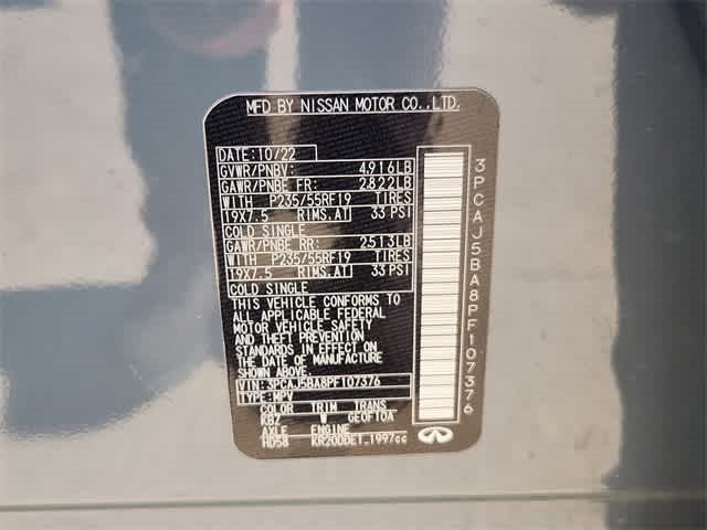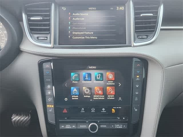 4-Wheel Disc Brakes, 6 Speakers, ABS brakes, Air Conditioning, Alloy wheels, AM/FM radio: SiriusXM, Auto High-beam Headlights, Auto-dimming Rear-View mirror, Automatic temperature control, Brake assist, Bumpers: body-color, CD player, Delay-off headlights, Driver door bin, Driver vanity mirror, Dual front impact airbags, Dual front side impact airbags, Electronic Stability Control, Emergency communication system: INFINITI InTouch (1-year complimentary trial), Exterior Parking Camera Rear, Floor Mats, Four wheel independent suspension, Front anti-roll bar, Front Bucket Seats, Front Center Armrest, Front dual zone A/C, Front reading lights, Fully automatic headlights, Garage door transmitter: HomeLink, Heated door mirrors, Heated Front Bucket Seats, Heated front seats, Illuminated entry, Illuminated Kick Plates, Knee airbag, Leather Shift Knob, Leather steering wheel, Leather-Appointed Seat Trim, Literature Kit, Low tire pressure warning, Memory seat, Occupant sensing airbag, Outside temperature display, Overhead airbag, Overhead console, Panic alarm, Passenger door bin, Passenger vanity mirror, Power door mirrors, Power driver seat, Power Liftgate, Power moonroof, Power passenger seat, Power steering, Power windows, Radio data system, Radio: HD Audio System, Rear anti-roll bar, Rear Parking Sensors, Rear reading lights, Rear seat center armrest, Rear side impact airbag, Rear window defroster, Rear window wiper, Remote keyless entry, Security system, Speed control, Speed-sensing steering, Speed-Sensitive Wipers, Splash Guards (Set of 4), Split folding rear seat, Spoiler, Steering wheel mounted audio controls, Tachometer, Telescoping steering wheel, Tilt steering wheel, Traction control, Trip computer, Turn signal indicator mirrors, Variably intermittent wipers, Wheels: 19 Silver Painted Aluminum Alloy. Clean CARFAX.