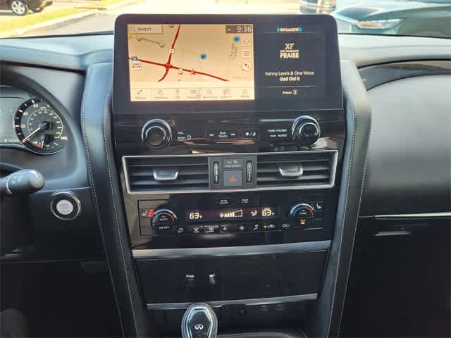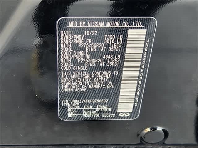 Certified. **Factory Certified Pre-owned Vehicle!, **Panoramic Moonroof!, **Navigation!, **Rear View Back-Up Camera!, **Back Up Warning Sensors!, **Blind Spot Technology, 13 Speakers, 2.937 Axle Ratio, 3rd row seats: split-bench, 4-Wheel Disc Brakes, ABS brakes, Air Conditioning, Alloy wheels, AM/FM radio: SiriusXM, Anti-whiplash front head restraints, Auto High-beam Headlights, Auto tilt-away steering wheel, Auto-dimming door mirrors, Auto-dimming Rear-View mirror, Auto-leveling suspension, Automatic temperature control, Brake assist, Bumpers: body-color, Cargo Net, Cargo Package, Carpeted Cargo Mat, Center Console Tray, Compass, Console Net, Delay-off headlights, Driver door bin, Driver vanity mirror, Dual front impact airbags, Dual front side impact airbags, Electronic Stability Control, Emergency communication system: INFINITI InTouch, First-Aid Kit, Four wheel independent suspension, Front anti-roll bar, Front Bucket Seats, Front Center Armrest, Front dual zone A/C, Front fog lights, Front reading lights, Fully automatic headlights, Garage door transmitter: HomeLink, Heated door mirrors, Heated Front Bucket Seats, Heated front seats, Heated steering wheel, Illuminated entry, INFINITI Radiant Illuminated Kick Plates (N93), Leather Shift Knob, Leather steering wheel, Leather-Appointed Seats, Literature Kit, Low tire pressure warning, Memory seat, Navigation system: INFINITI InTouch Navigation, Occupant sensing airbag, Outside temperature display, Overhead airbag, Overhead console, Panic alarm, Passenger door bin, Passenger vanity mirror, Power door mirrors, Power driver seat, Power Liftgate, Power moonroof, Power passenger seat, Power steering, Power windows, Premium audio system: Bose, Radio data system, Radio: Bose Premium Audio System w/13 Speakers, Rain sensing wipers, Rear air conditioning, Rear anti-roll bar, Rear reading lights, Rear seat center armrest, Rear window defroster, Rear window wiper, Reclining 3rd row seat, Remote keyless entry, Security system, Speed control, Speed-sensing steering, Split folding rear seat, Spoiler, Steering wheel memory, Steering wheel mounted audio controls, Tachometer, Telescoping steering wheel, Tilt steering wheel, Traction control, Trip computer, Turn signal indicator mirrors, Variably intermittent wipers, Voltmeter, Wheels: 20 x 8.0 Aluminum-Alloy. CARFAX One-Owner.