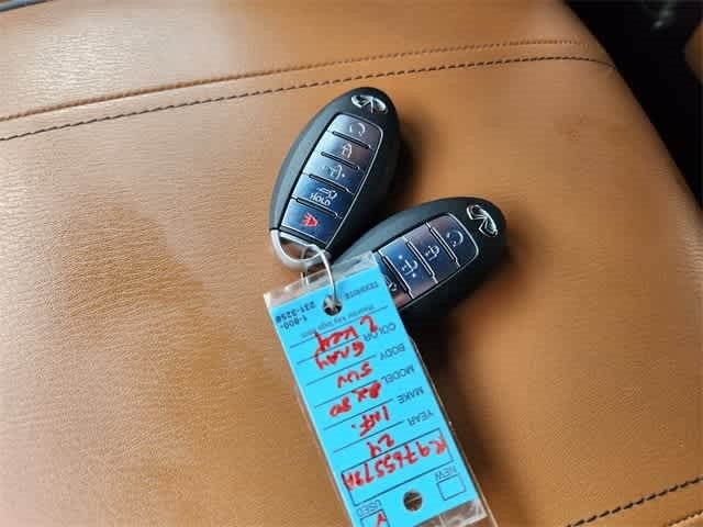 17 Speakers, 2.937 Axle Ratio, 3rd row seats: bench, 4-Wheel Disc Brakes, ABS brakes, Air Conditioning, Alloy wheels, AM/FM radio: SiriusXM, Anti-whiplash front head restraints, Apple CarPlay/Android Auto, Auto High-beam Headlights, Auto tilt-away steering wheel, Auto-dimming door mirrors, Auto-dimming Rear-View mirror, Auto-leveling suspension, Automatic temperature control, Black Painted Mirror Caps, Brake assist, Bumpers: body-color, Cargo Package, Climate Controlled Front Bucket Seats, Compass, Console Net, Dark Chrome Front Fascia Trim, Dark Chrome Grille Surround, Delay-off headlights, Driver door bin, Driver vanity mirror, Dual front impact airbags, Dual front side impact airbags, Electronic Stability Control, Emergency communication system: INFINITI InTouch, First-Aid Kit, Four wheel independent suspension, Front anti-roll bar, Front Bucket Seats, Front Center Armrest, Front dual zone A/C, Front fog lights, Front reading lights, Fully automatic headlights, Garage door transmitter: HomeLink, Heated door mirrors, Heated front seats, Heated rear seats, Heated steering wheel, Illuminated entry, Leather Shift Knob, Leather steering wheel, Literature Kit, Low tire pressure warning, Memory seat, Moisture-Resistant Rear Cargo Carpet, Navigation system: INFINITI InTouch Navigation, Nylon-Cord Cargo Net, Occupant sensing airbag, Outside temperature display, Overhead airbag, Overhead console, Panic alarm, Passenger door bin, Passenger vanity mirror, Perforated Semi-Aniline Leather-Appointed Seats, Power door mirrors, Power driver seat, Power Liftgate, Power moonroof, Power passenger seat, Power steering, Power windows, Radio data system, Radio: Bose Performance Audio System w/17 Speakers, Rain sensing wipers, Rear air conditioning, Rear anti-roll bar, Rear reading lights, Rear seat center armrest, Rear window defroster, Rear window wiper, Reclining 3rd row seat, Remote keyless entry, Roof Rail Cross Bars, Security system, Sensory Dark Chrome Appearance Package, Speed control, Speed-sensing steering, Split folding rear seat, Spoiler, Steering wheel memory, Steering wheel mounted audio controls, Tachometer, Telescoping steering wheel, Tilt steering wheel, Traction control, Trip computer, Turn signal indicator mirrors, Variably intermittent wipers, Ventilated front seats, Voltmeter, Wheels: 22 Dark Chrome Cast Aluminum-Alloy. Clean CARFAX. CARFAX One-Owner.
